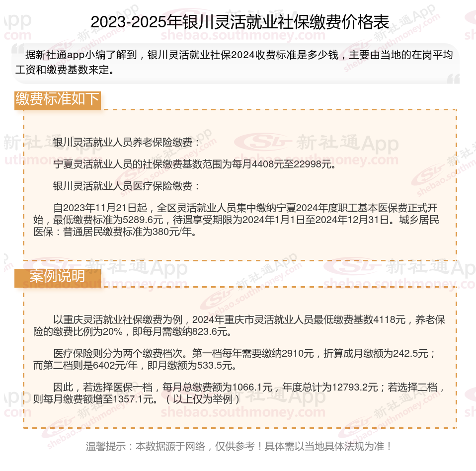据新社通app数据显示,2024-2025年银川灵活就业人员养老保险的缴费标准是根据缴费基数来确定的: