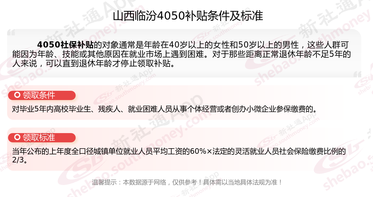 山西临汾4050社保补贴多少钱一个月?山西临汾4050社保补贴2025年最新标准是多少?2025山西临汾4050补贴主要针对的是年龄在40岁以上的女性和50岁以上的男性,这些人群通常因为年龄较大而面临就业困难。