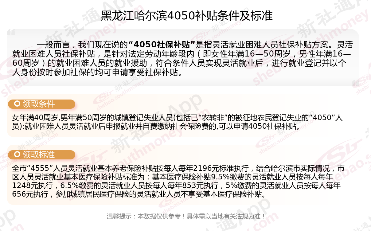 二、2025年黑龙江哈尔滨4050社保补贴标准是多少?领取条件是什么?