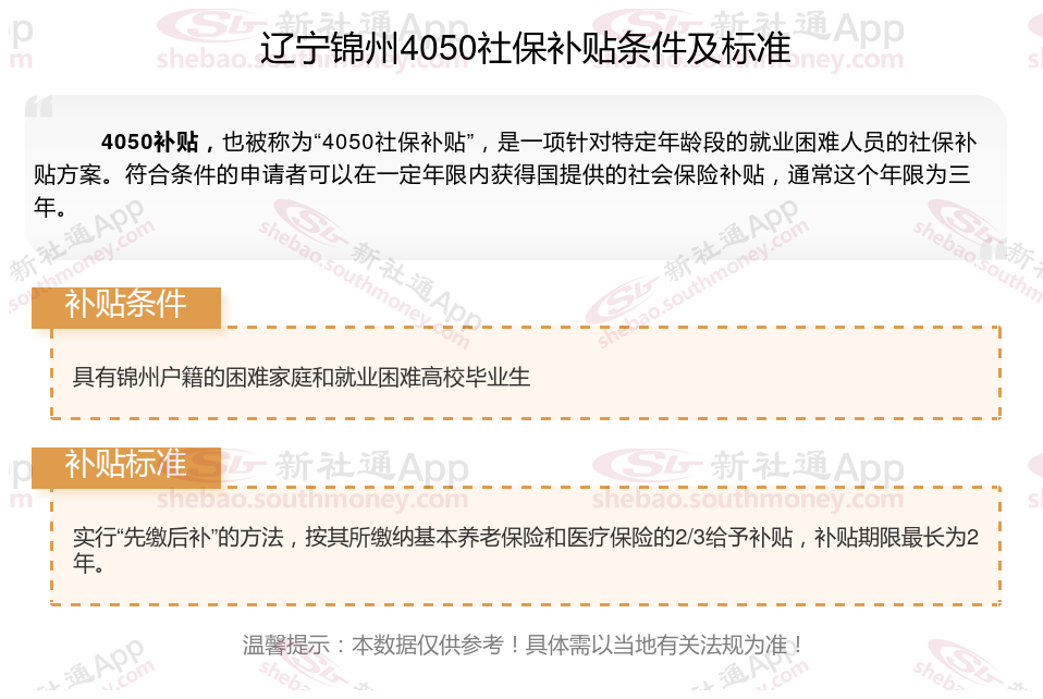 一、2025年辽宁锦州4050社保补贴标准及条件来了