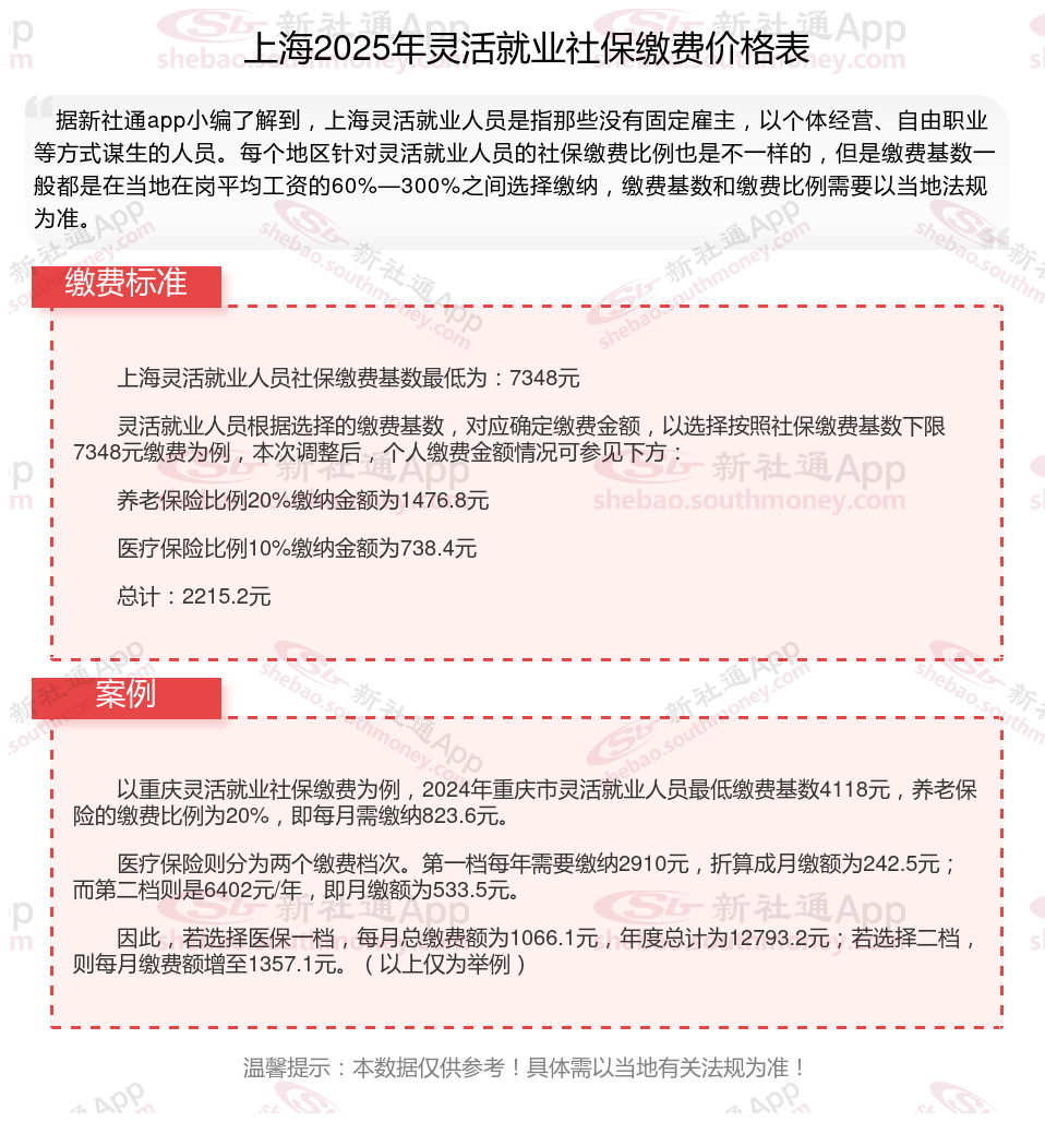 据新社通app数据显示,上海灵活就业养老保险缴费基数2024-2025年最新标准如下: