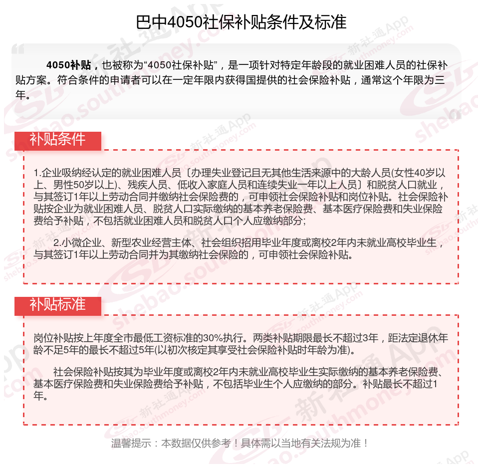 二、2025年巴中4050社保补贴标准及条件,最新如下:
