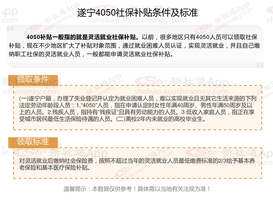2025遂宁4050补贴主要针对的是年龄在40岁以上的女性和50岁以上的男性,这些人群通常因为年龄较大而面临就业困难。