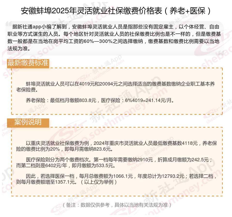 据新社通app数据显示,2024-2025年安徽蚌埠灵活就业人员养老保险的缴费标准: