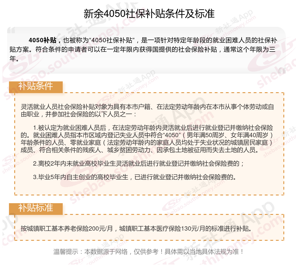 新余4050灵活就业社保补贴标准如何?“4050补贴”主要是针对大龄就业困难人群的社保补贴,申请条件包括年龄、就业困难、灵活就业并自费缴纳社保,需要持有失业登记证,不同地区可能有细微差别,比如农村户口的限制。那么新余4050灵活就业社保补贴标准是多少钱?新余4050社保补贴条件是什么?接下来随新社通APP小编了解一下新余4050灵活就业社保补贴标准最新资讯。