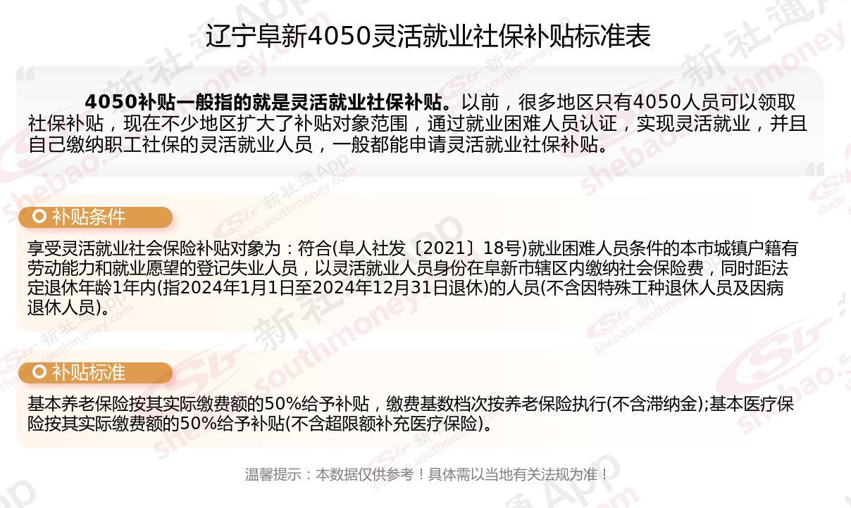 以上就是辽宁阜新4050灵活就业社保补贴的相关内容,欢迎关注新社通/下载新社通APP了解更多五险一金专业资讯。