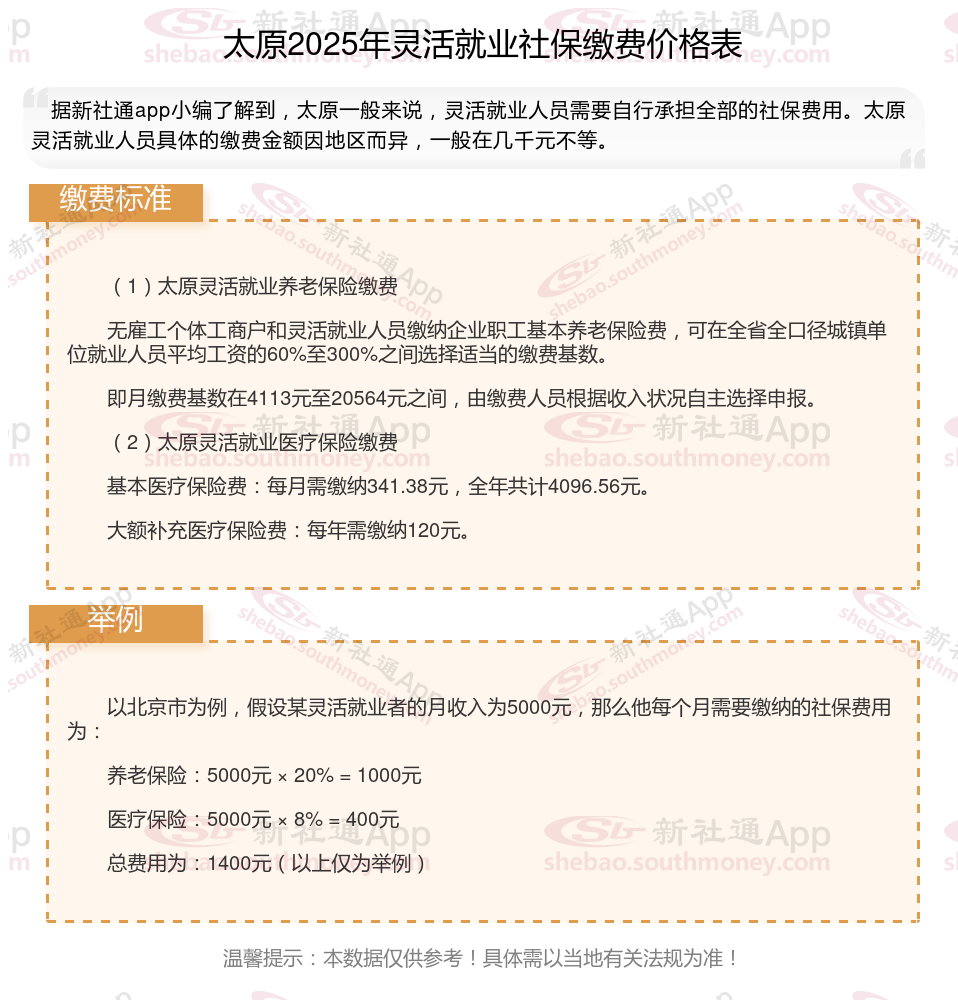 据新社通app数据显示,太原灵活就业养老保险最低缴费基数为:4113元;个人的缴费比例分别为:20%;