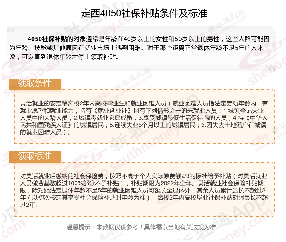 今天聊一下4050补贴话题。4050补贴听起来像是一个针对特定年龄人群的社保补贴。比如女性需年满40周岁,男性需年满50周岁(以申请当年12月31日为截止日期)。那么定西4050灵活就业社保补贴标准是多少钱?定西4050社保补贴条件是什么?接下来随新社通APP小编了解一下最新资讯。