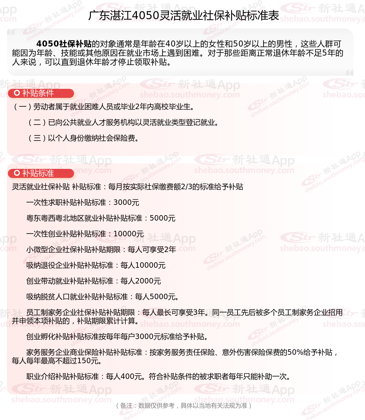 以上就是广东湛江4050灵活就业社保补贴的相关内容,欢迎关注新社通/下载新社通APP了解更多五险一金专业资讯。