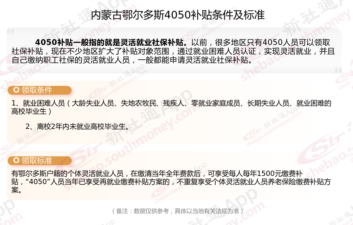 一、2023-2024年内蒙古鄂尔多斯4050社保补贴标准及条件是多少?