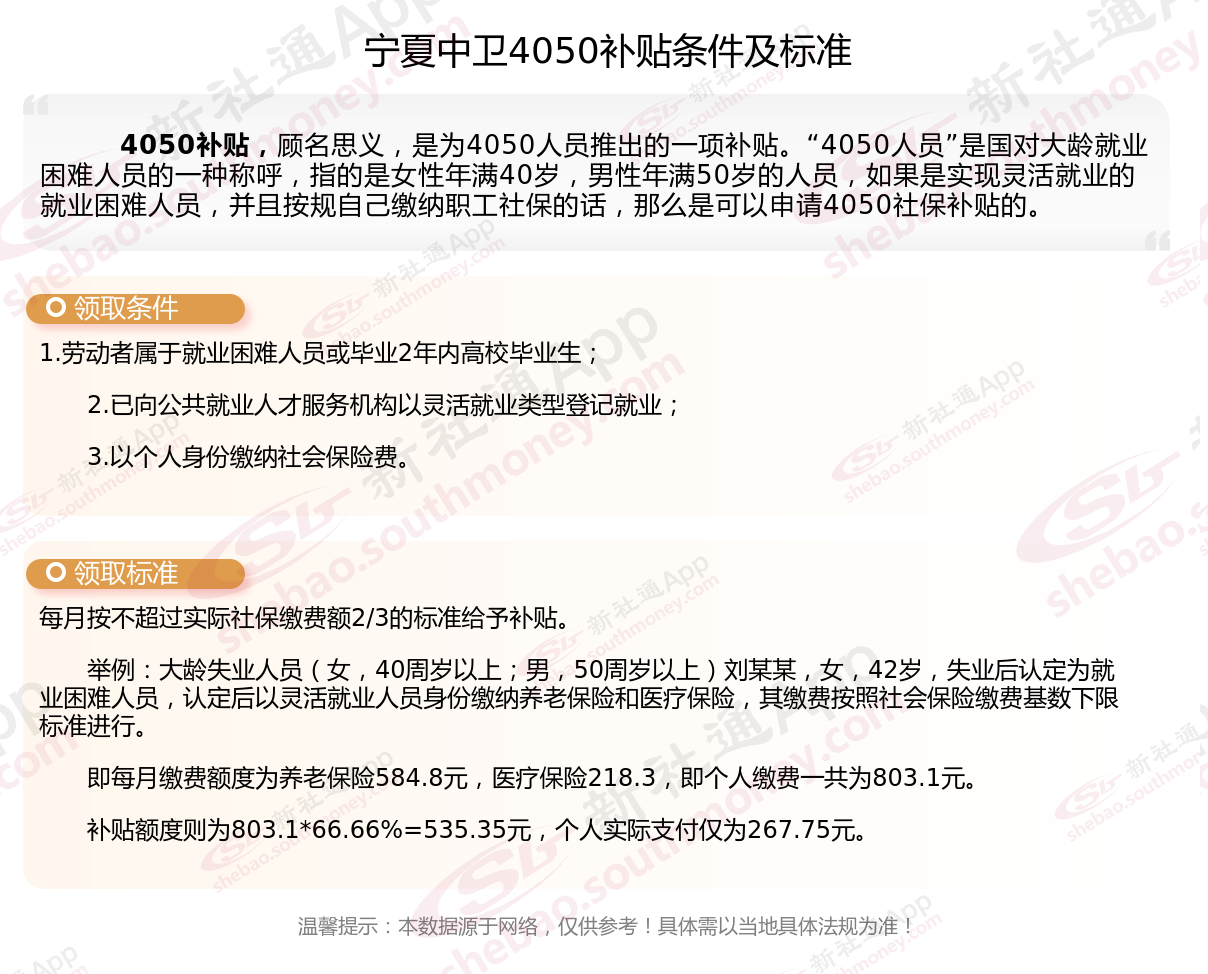 4050社保补贴标准据新社通app小编了解,通常,4050社保补贴包含基本医疗保险和基本养老保险两个险种,社保补贴金额为申请人实际缴纳基本养老保险和基本医疗保险金额的2/3,具体标准以当地社保局公布的数据为准!那么宁夏中卫灵活就业人员4050补贴最新标准是多少,宁夏中卫4050灵活就业人员社保补贴一年可以有多少钱?接下来随新社通APP小编具体了解一下4050社保补贴内容。