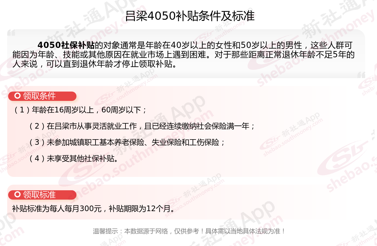 二、2025年吕梁4050社保补贴标准(吕梁4050灵活就业人员补贴标准是多少钱?吕梁2025年4050补贴新规能领多少钱?)