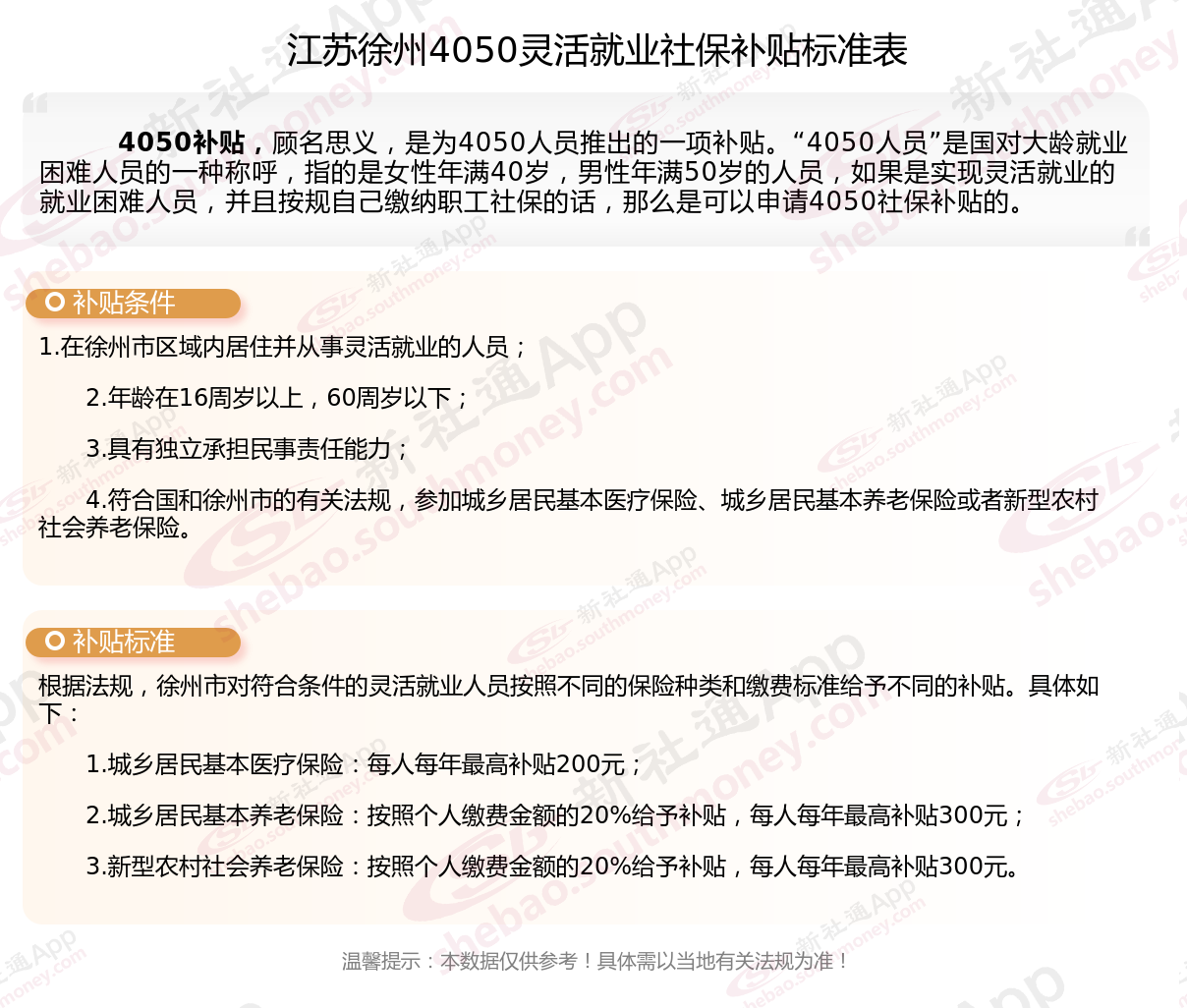 以上就是江苏徐州4050灵活就业社保补贴的相关内容,欢迎关注新社通/下载新社通APP了解更多五险一金专业资讯。