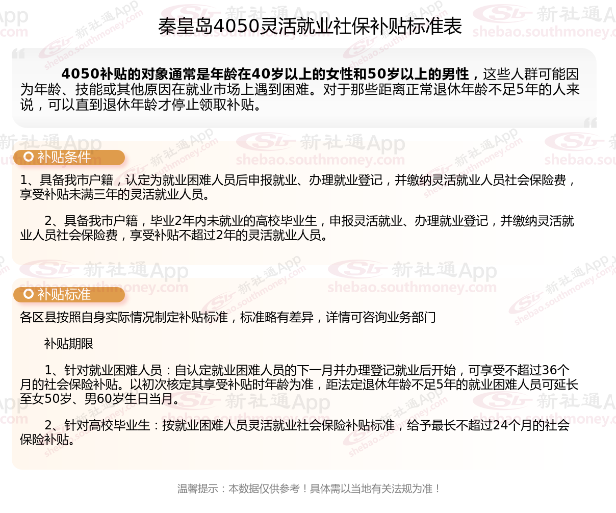 一、秦皇岛4050社保补贴标准及条件是多少?