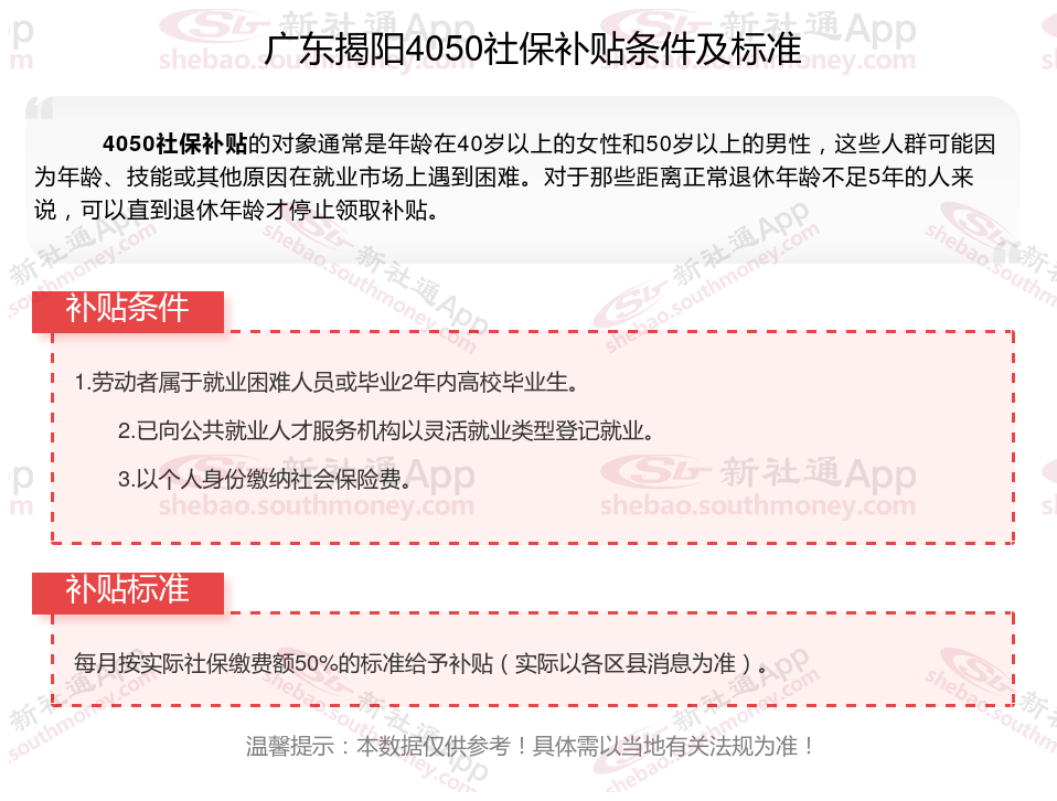 一、2023-2024年广东揭阳4050社保补贴标准及条件,最新如下