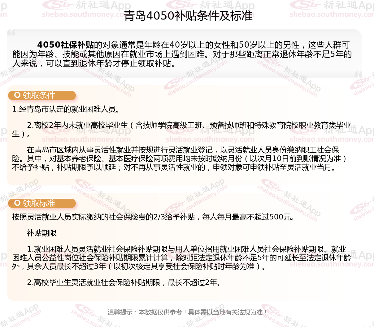 二、2025年青岛4050社保补贴标准及条件,最新如下: