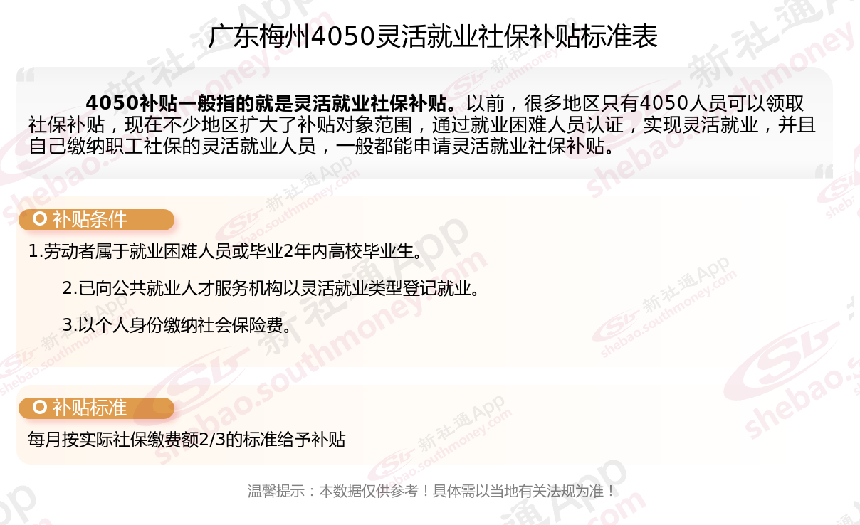 以上就是广东梅州4050灵活就业社保补贴的相关内容,欢迎关注新社通/下载新社通APP了解更多五险一金专业资讯。