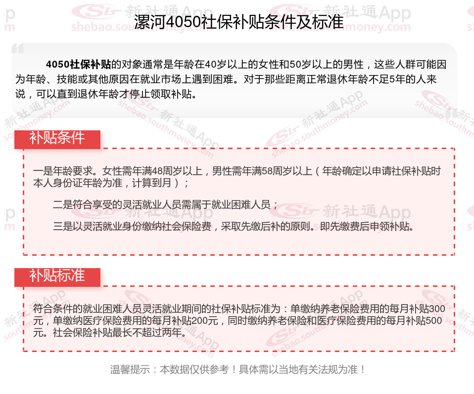二、2025年漯河4050社保补贴标准是多少?领取条件是什么?