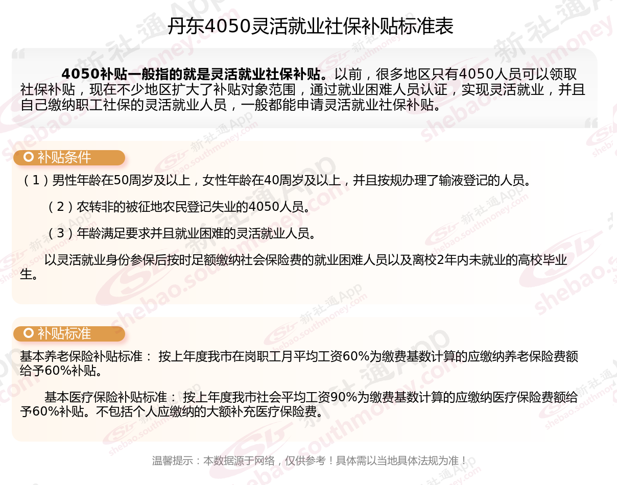 二、2025年丹东4050社保补贴标准及条件,最新如下: