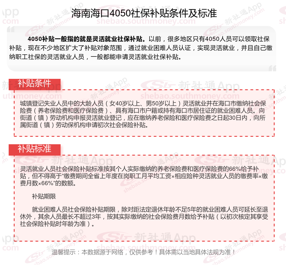 二、2025年海南海口4050社保补贴标准及条件,最新如下:
