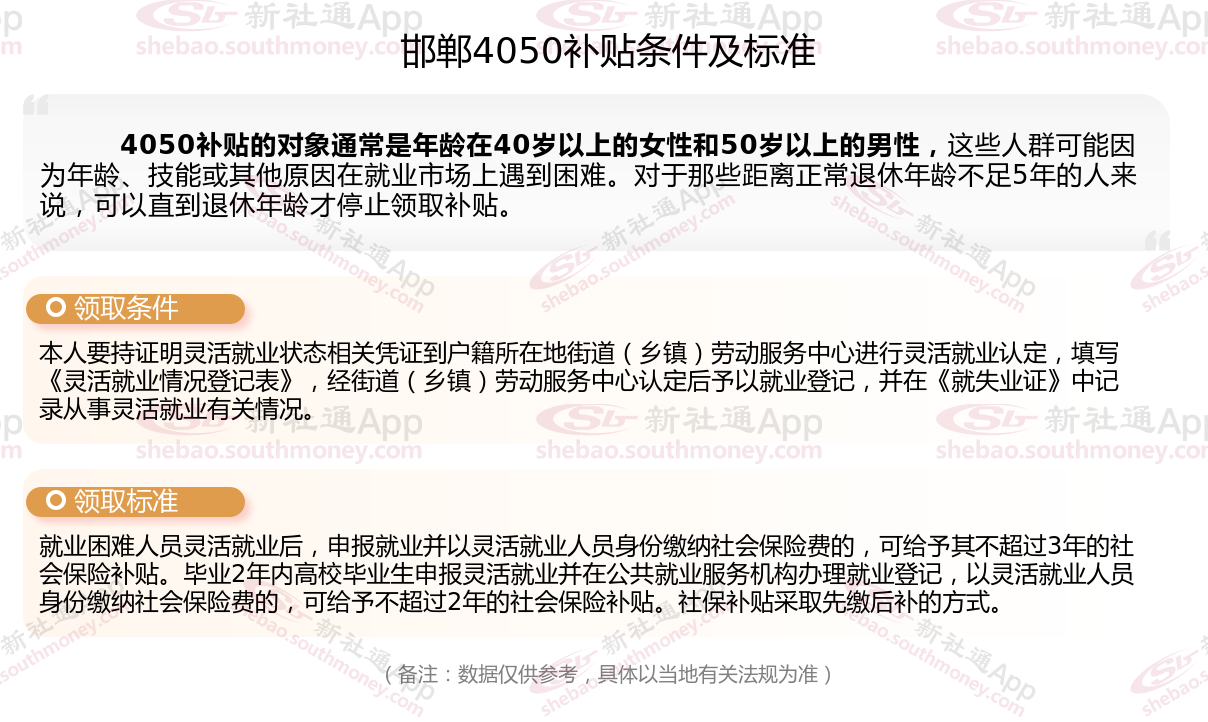 一、2023-2024年邯郸4050社保补贴标准及条件是多少?