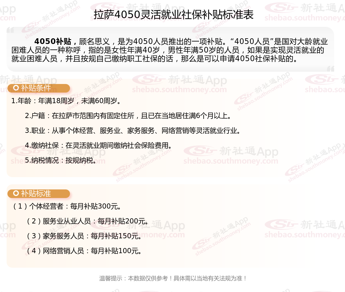 拉萨4050社保补贴多少钱一个月?拉萨4050社保补贴2025年最新标准是多少?2025拉萨4050补贴主要针对的是年龄在40岁以上的女性和50岁以上的男性,这些人群通常因为年龄较大而面临就业困难。