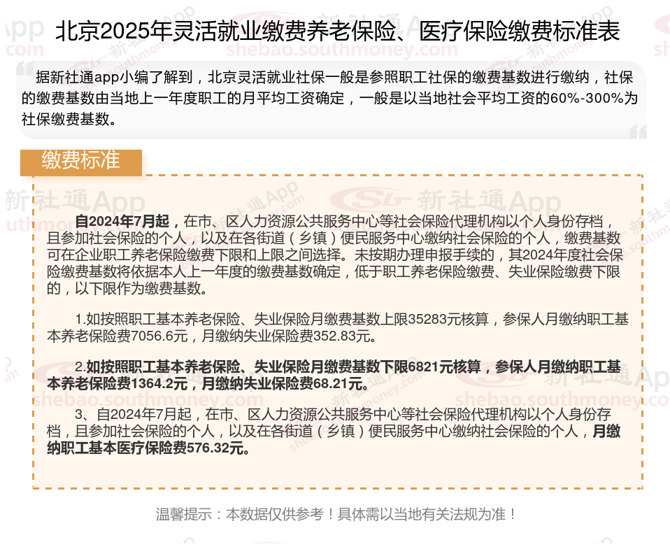 据新社通app数据显示,2024-2025年北京灵活就业人员养老保险的缴费标准是根据缴费基数来确定的: