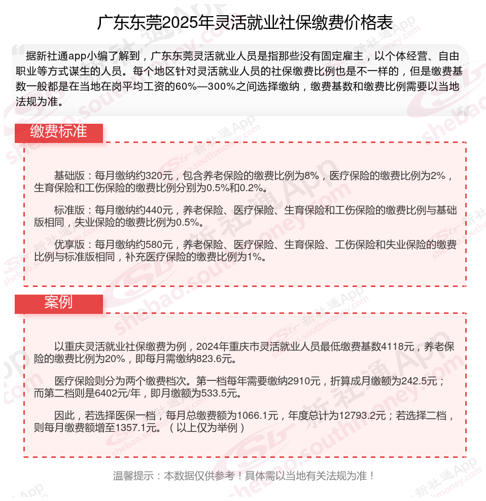 据新社通app数据显示,2024-2025年广东东莞灵活就业人员养老保险的缴费标准是根据缴费基数来确定的: