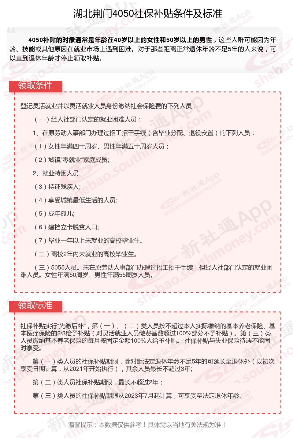 一、2025年湖北荆门灵活就业4050社保补贴标准最新是多少?