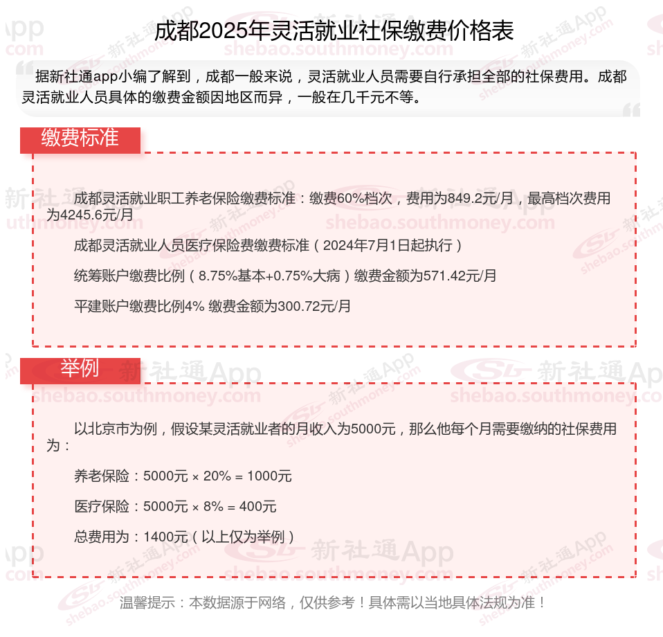 据新社通app数据显示,2024-2025年成都灵活就业人员养老保险的缴费标准: