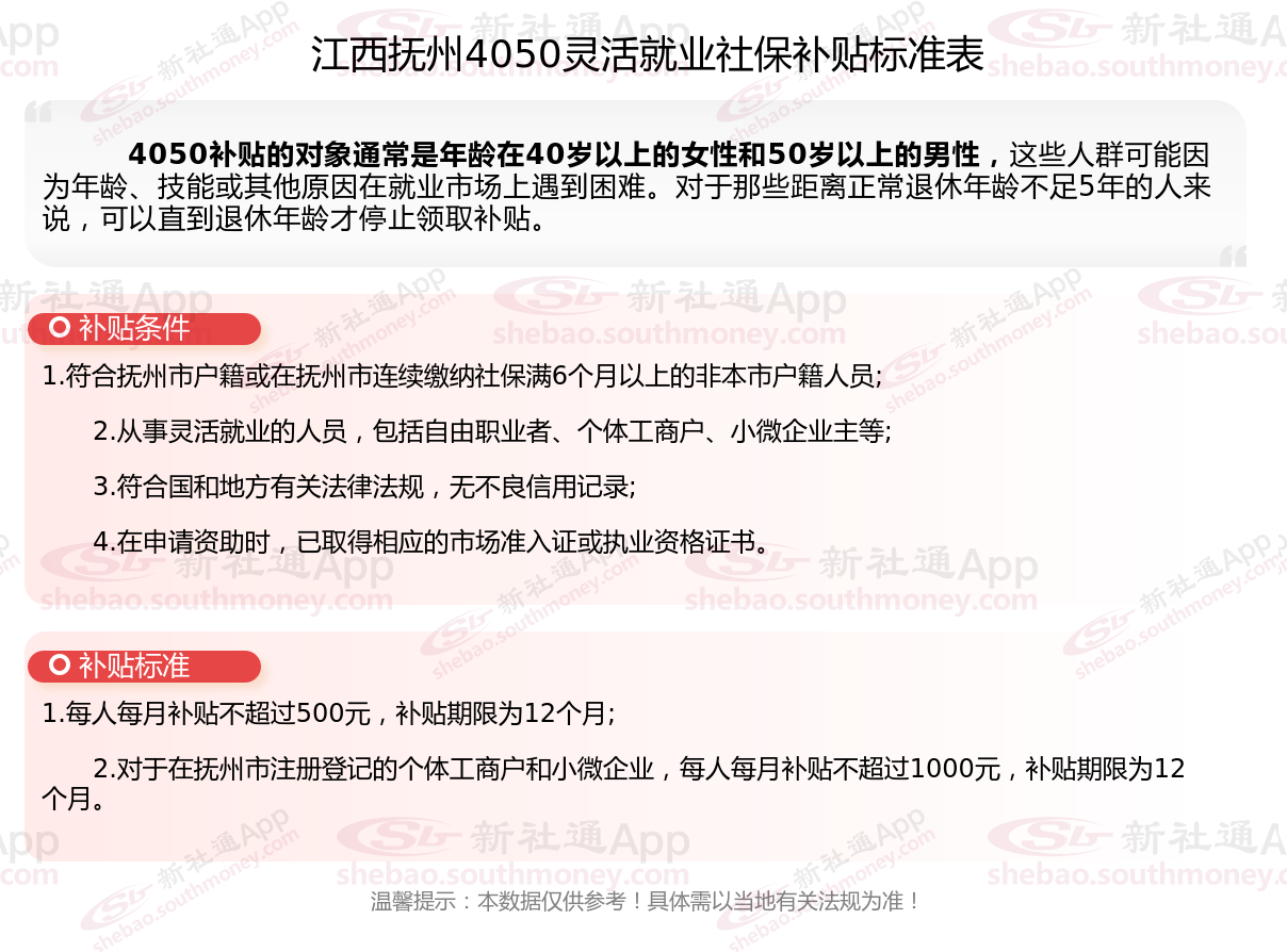 以上就是江西抚州4050灵活就业社保补贴的相关内容,欢迎关注新社通/下载新社通APP了解更多五险一金专业资讯。