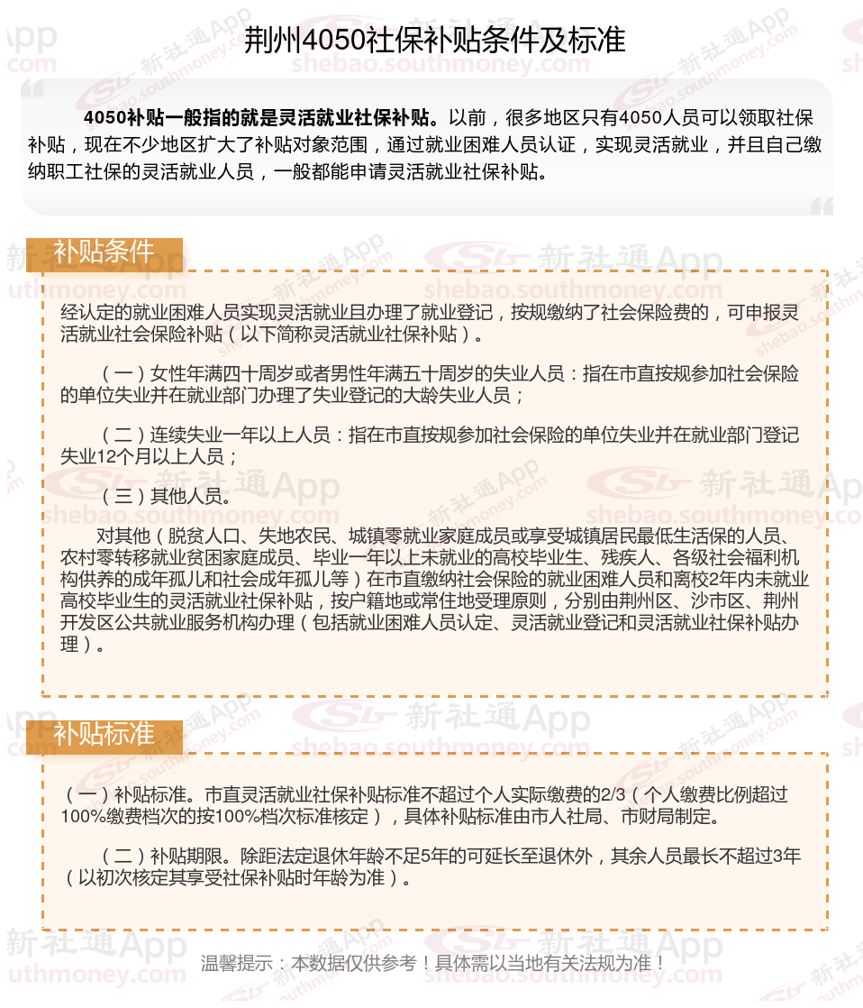 荆州4050灵活就业社保补贴是什么?今天聊一下4050补贴话题。4050补贴听起来像是一个针对特定年龄人群的社保补贴。比如女性需年满40周岁,男性需年满50周岁(以申请当年12月31日为截止日期)。那么荆州4050灵活就业社保补贴标准是多少钱?荆州4050社保补贴可以领取多少?接下来随新社通APP小编了解一下荆州4050灵活就业社保补贴的最新资讯。