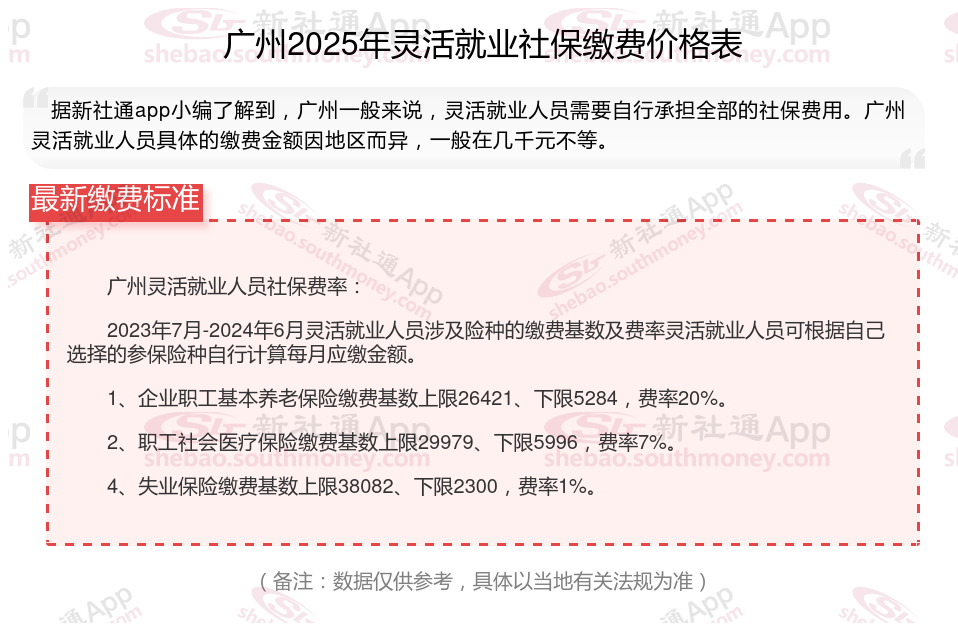 #广州灵活就业人员社保缴费2025年# 在当前的社保体系中,灵活就业人员作为特殊的群体,其社保缴费问题备受关注。本文就广州灵活就业人员社保缴费的种类和具体比例、费用,具体谈谈灵活就也人员的社保相关问题。下面随新社通小编一起来看看。