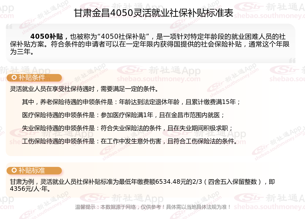 二、2025年甘肃金昌4050社保补贴标准及条件,最新如下: