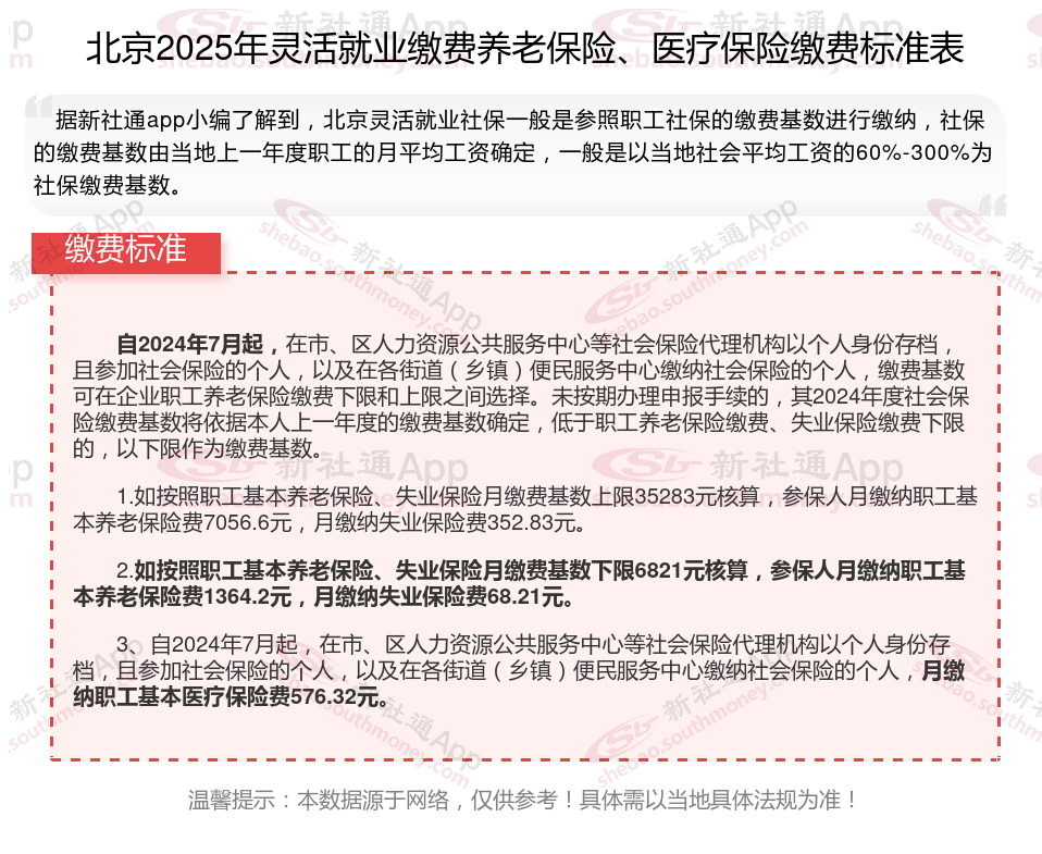 据新社通app数据显示,2024-2025年北京灵活就业人员养老保险的缴费标准: