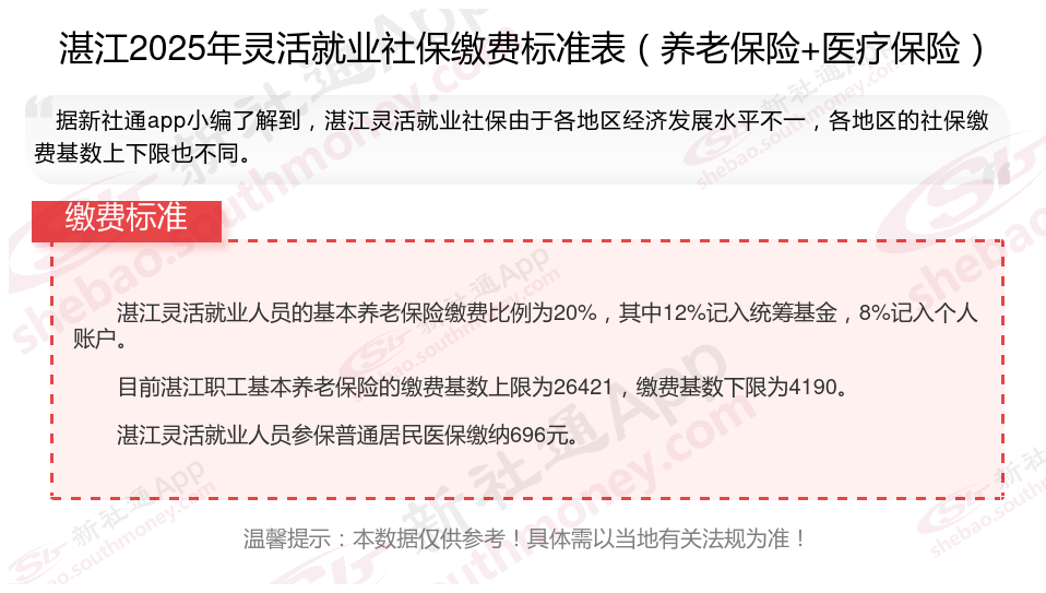 湛江灵活就业人员的社保缴费标准是多少?根据新社通app-社保缴费查询工具提供的最新数据如下: