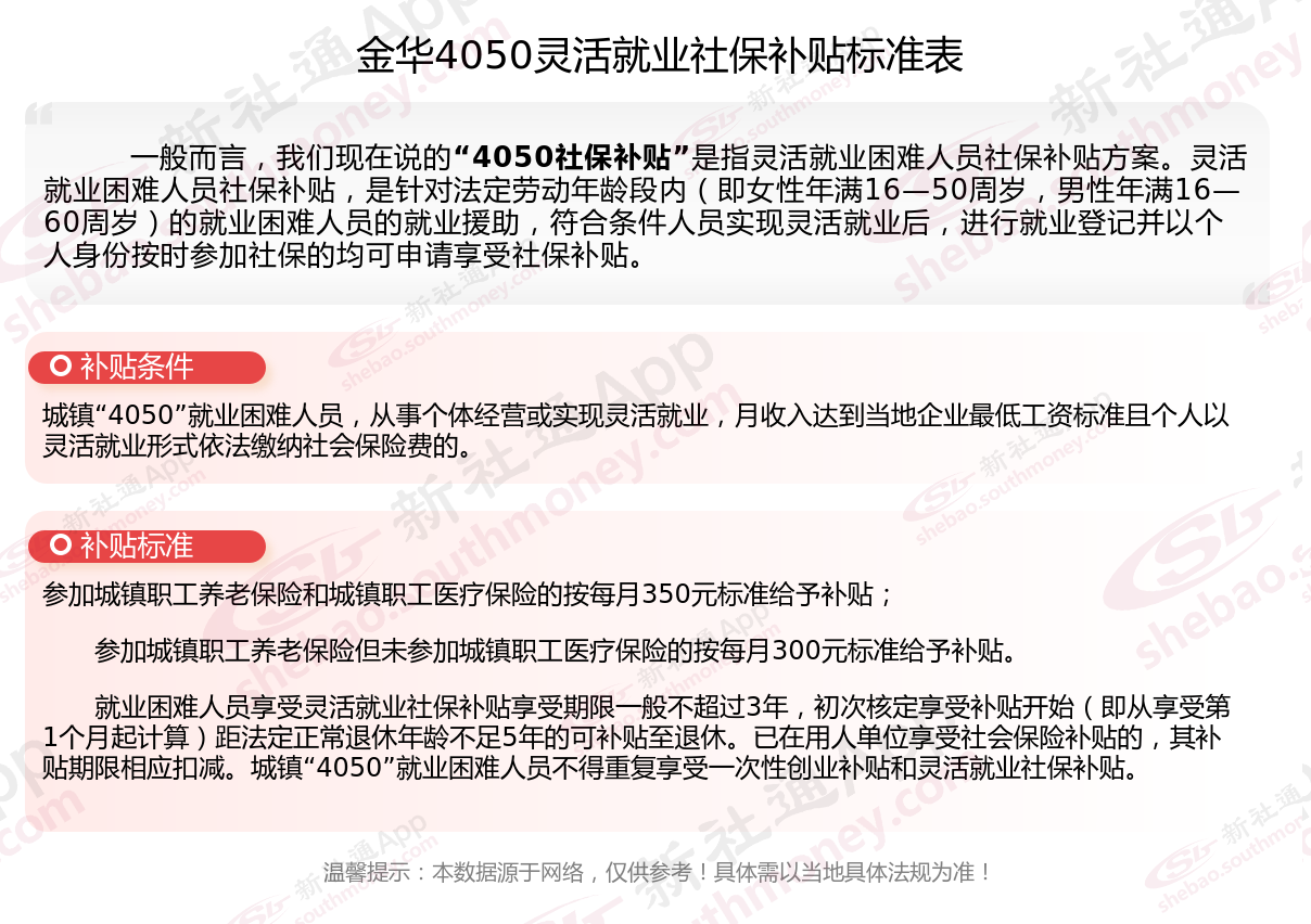 一、2023-2024年金华4050社保补贴标准及条件,最新如下