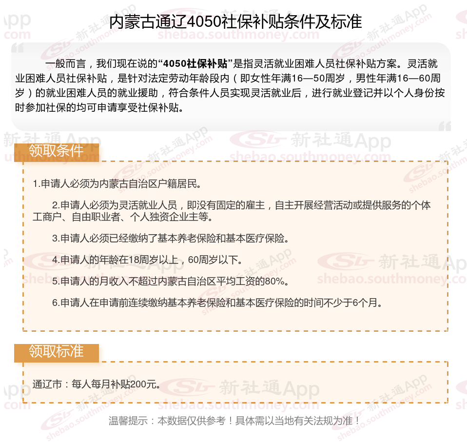 二、2025年内蒙古通辽4050社保补贴标准及条件,最新如下: