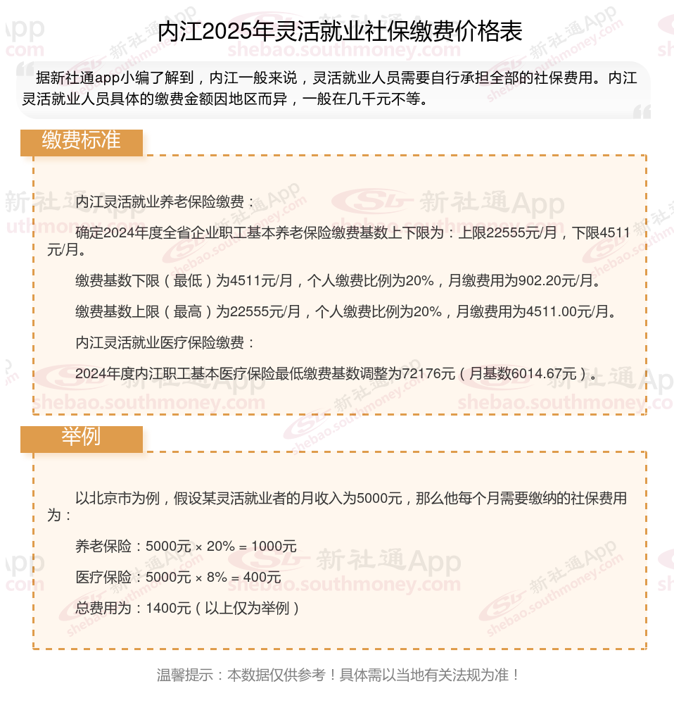 据新社通app数据显示,内江灵活就业养老缴费基数明细如下: