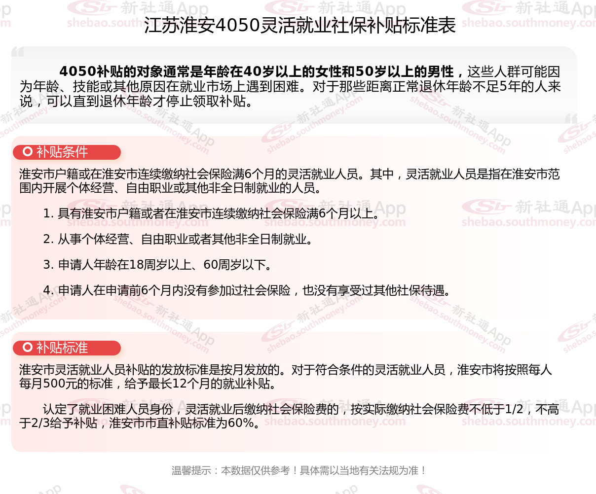 以上就是江苏淮安4050灵活就业社保补贴的相关内容,欢迎关注新社通/下载新社通APP了解更多五险一金专业资讯。