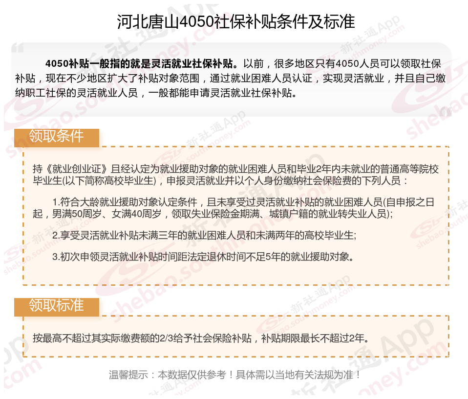 一、2023-2024年河北唐山灵活就业4050社保补贴标准和条件是什么