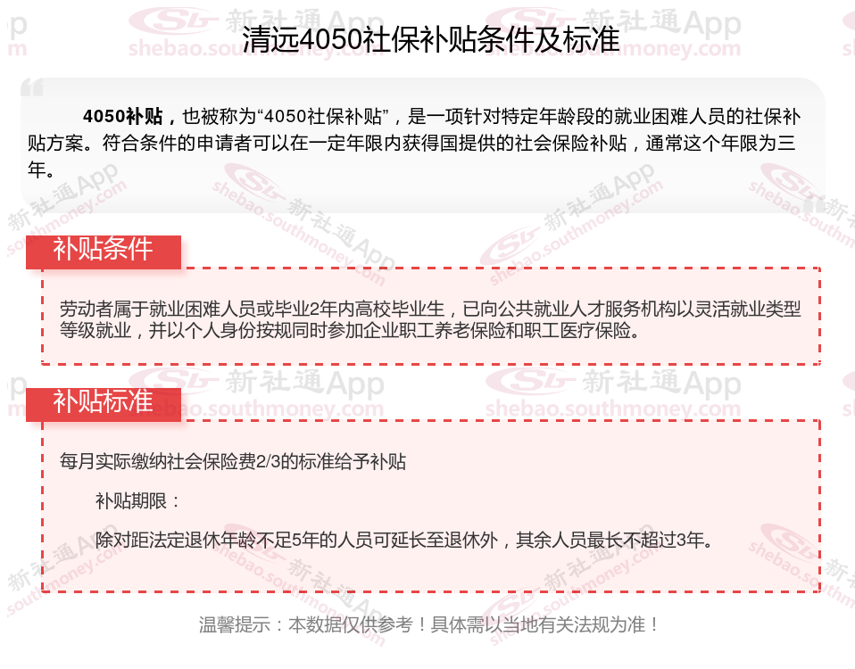 一、2023-2024年清远4050社保补贴标准及条件是多少?