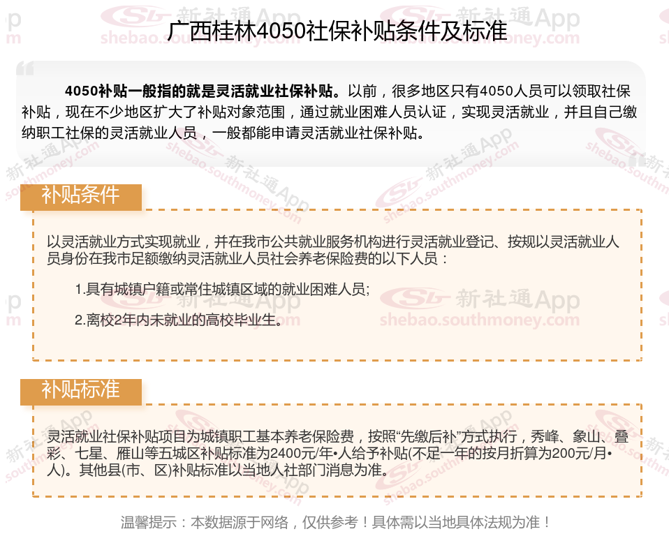 2025广西桂林灵活就业4050社保补贴是一项面向特定年龄段的就业困难人群的社会保险补贴。