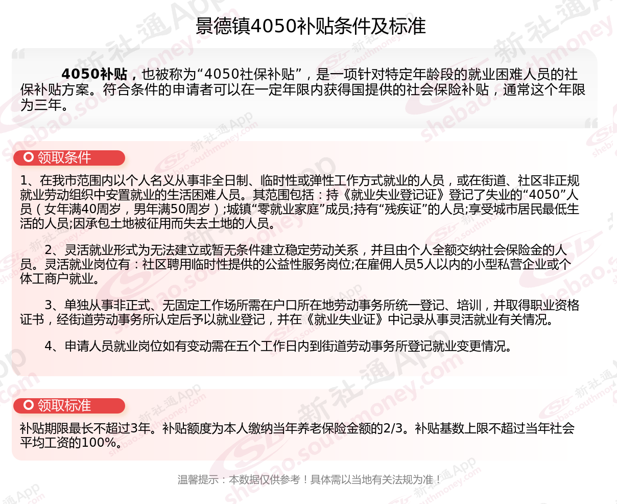 一、2023-2024年景德镇4050社保补贴标准及条件是多少?
