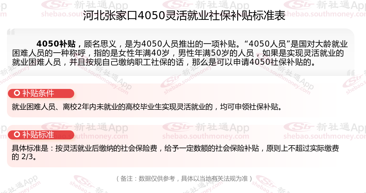 二、2025年河北张家口4050社保补贴标准(河北张家口4050灵活就业人员补贴标准是多少钱?河北张家口2025年4050补贴新规能领多少钱?)