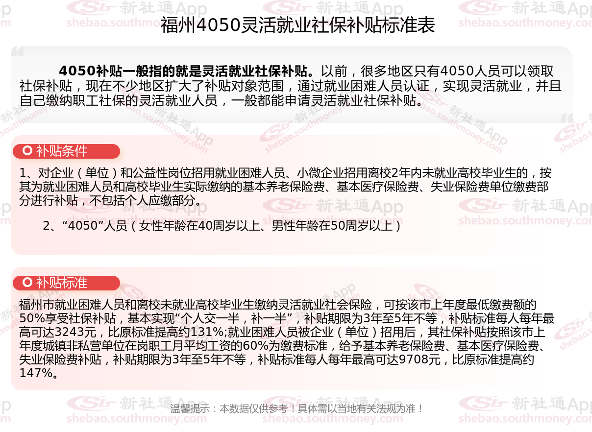 三、福州灵活就业4050社保补贴标准及条件是什么