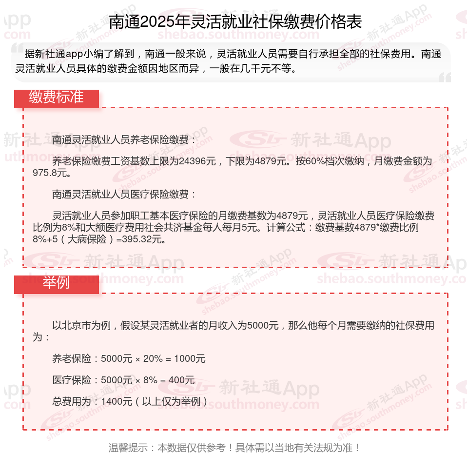 #南通灵活就业人员社保缴费2025年# 在当前的社保体系中,灵活就业人员作为特殊的群体,其社保缴费问题备受关注。本文就南通灵活就业人员社保缴费的种类和具体比例、费用,具体谈谈灵活就也人员的社保相关问题。下面随新社通小编一起来看看。
