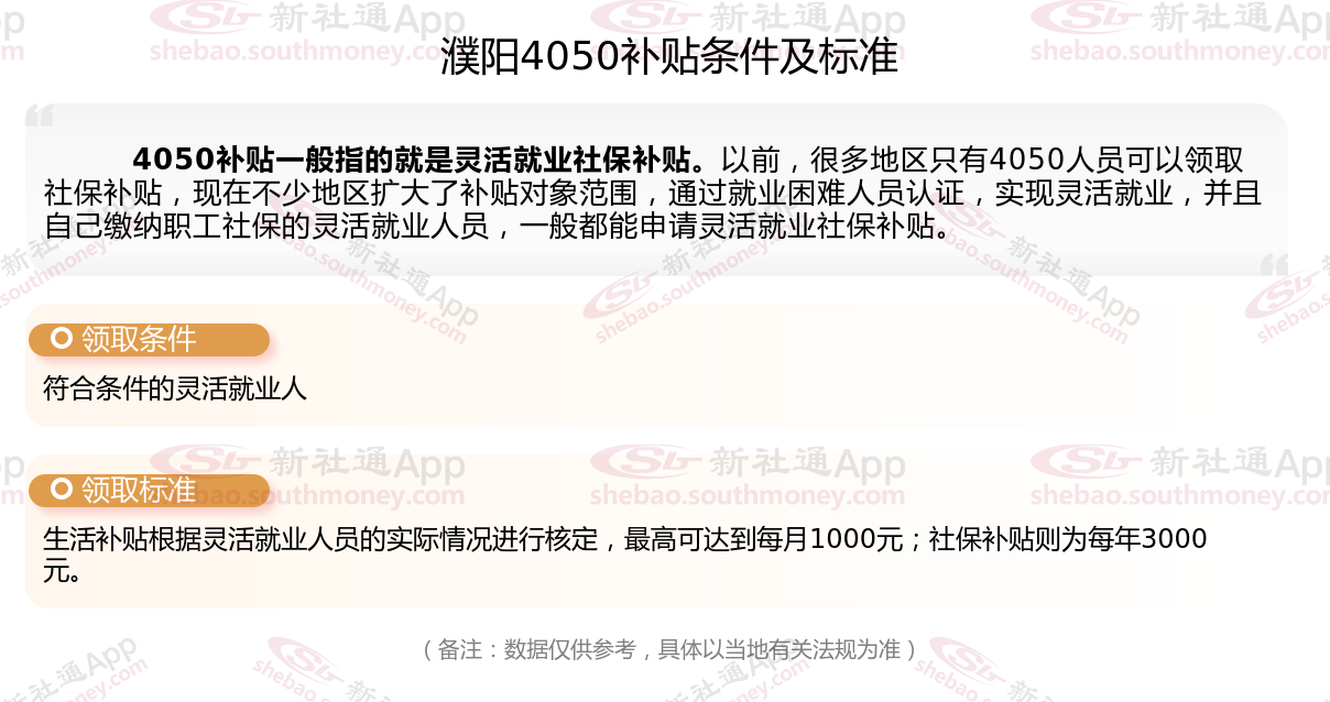 今天聊一下4050补贴的相关内容。4050补贴听起来像是一个针对特定年龄人群的社保补贴。比如女性需年满40周岁,男性需年满50周岁(以申请当年12月31日为截止日期)。那么濮阳4050灵活就业困难人员社保补贴多少钱?濮阳4050社保补贴可以申请吗?接下来随新社通APP小编具体了解一下4050社保补贴内容。