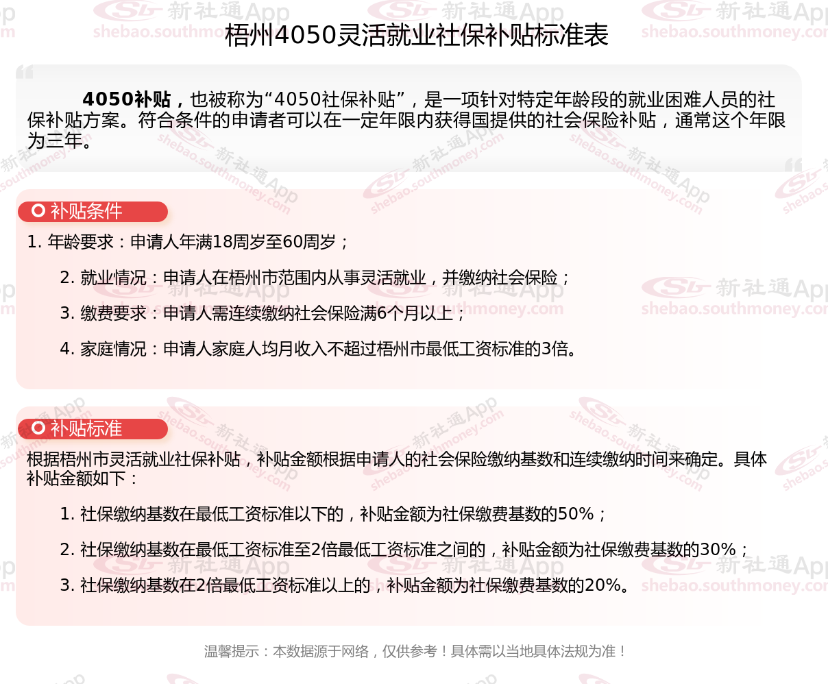 一、2025年梧州灵活就业4050社保补贴标准及条件是什么