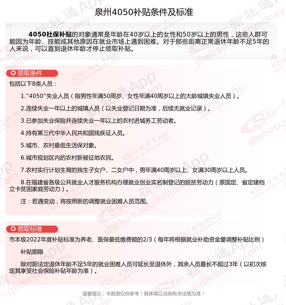 2025泉州4050补贴主要针对的是年龄在40岁以上的女性和50岁以上的男性,这些人群通常因为年龄较大而面临就业困难。